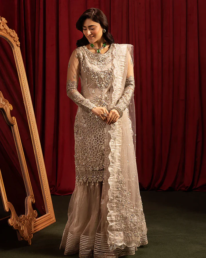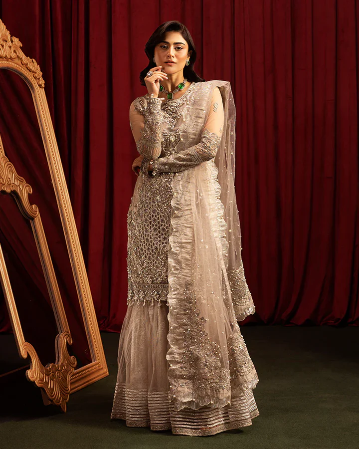 Net ghararah, featuring lace detailing, sequins, and tilla thread embroidery. ”