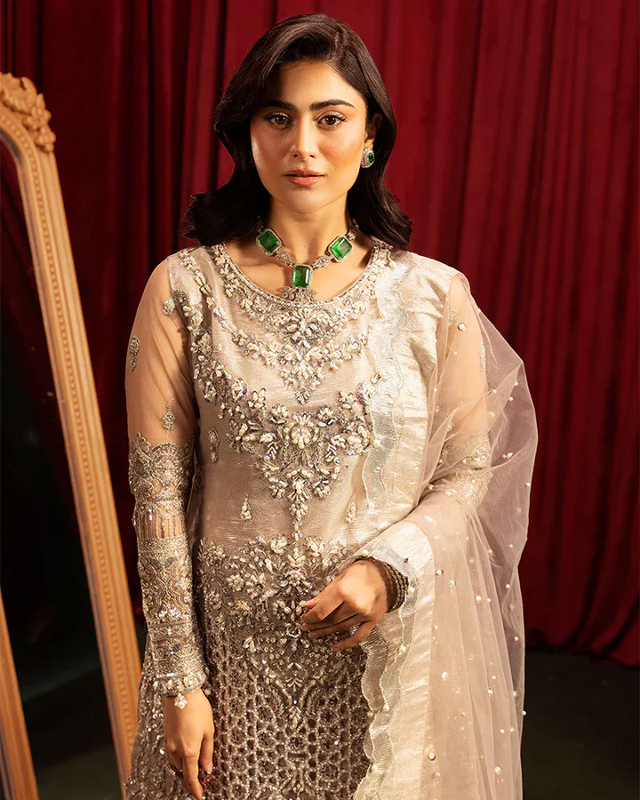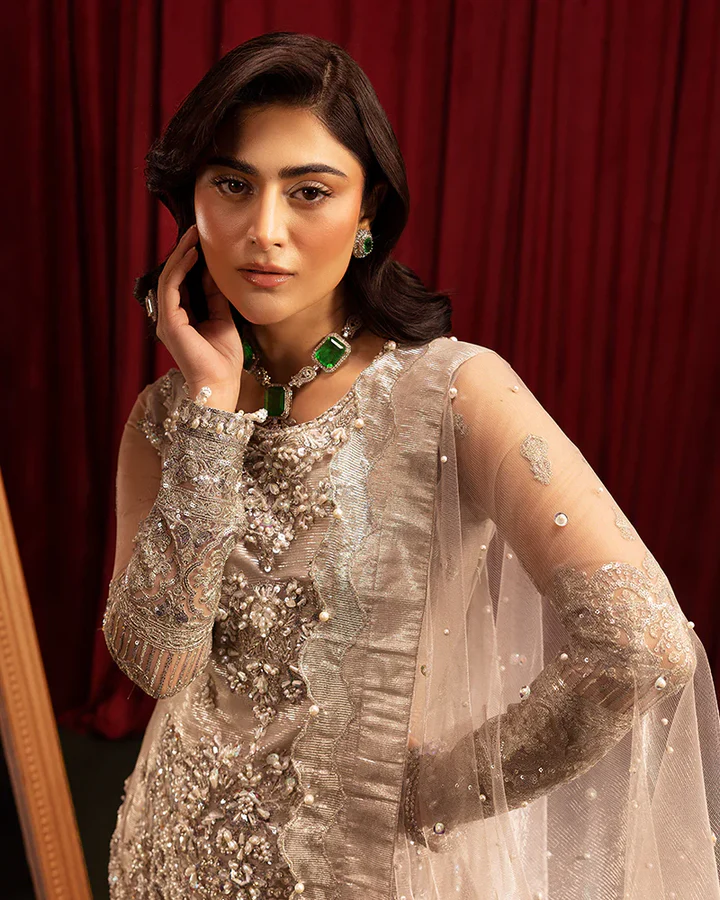 Artistry with our net shirt, Adorned with intricate embroidery pearls, naqshi, and dazzling dabka work, with hanging beads and tassels.