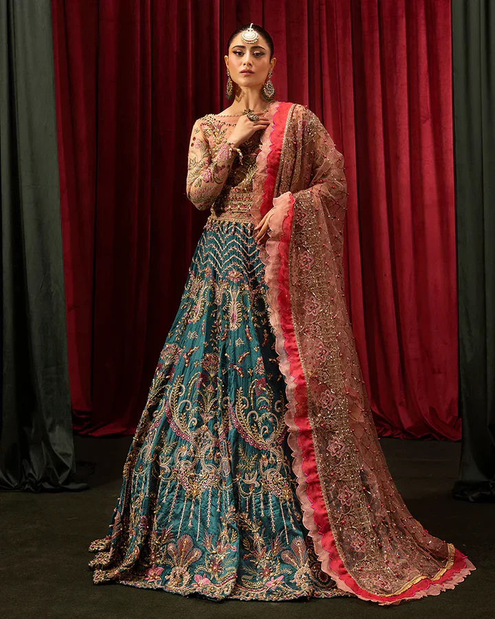 Net dupatta, artfully designed with pearls, sequins, and intricate thread work. The beautifully crafted border laces and scalloped edges