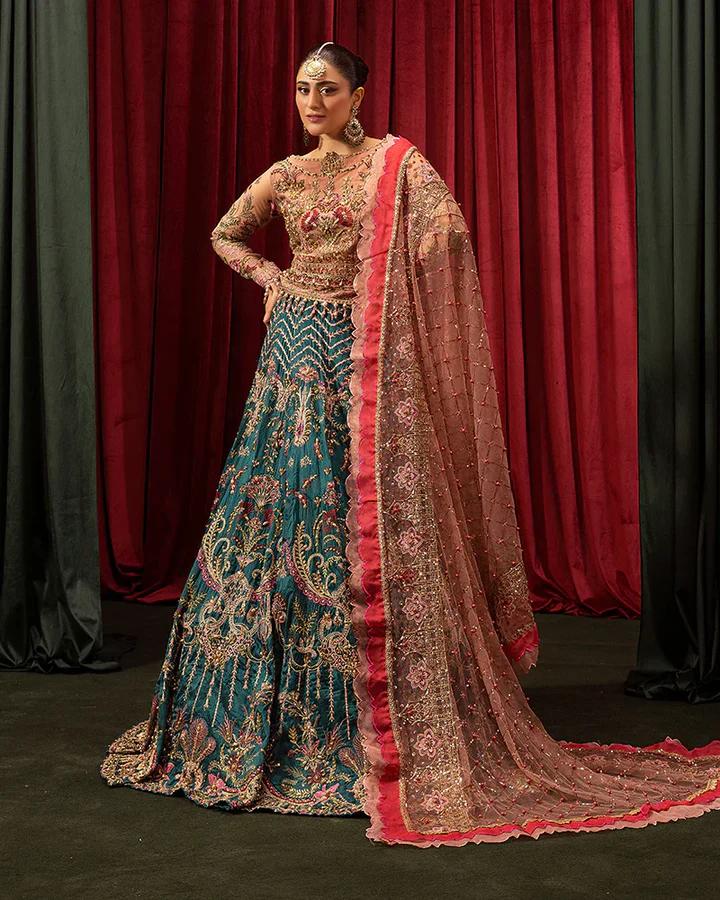 Raw silk lehenga is another highlight of this collection, enhanced with sequins and pearls combined with embroidery featuring both Swarovski and dabka work